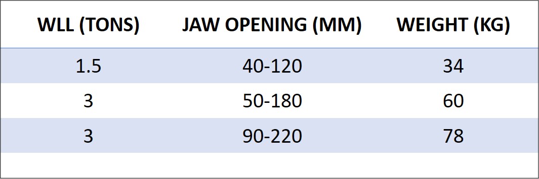 • Load Rating: WLL of 1.5 – 3 Tons (Specifications are based on the complete set of 3 clamps).